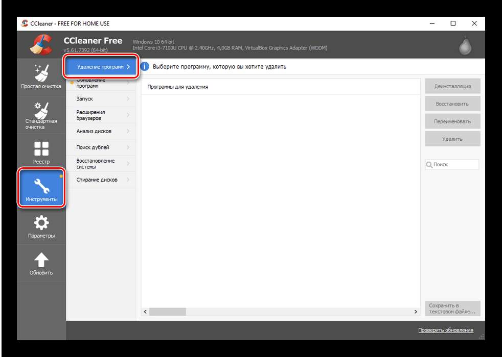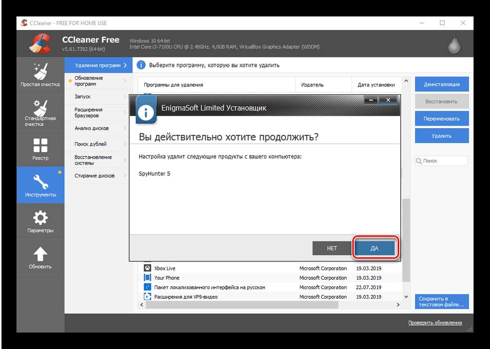 Приложение CCleaner тоже содержит подходящий для деинсталляции программ инструментарий, который очень эффективен в том числе и для стирания Spyhunter.