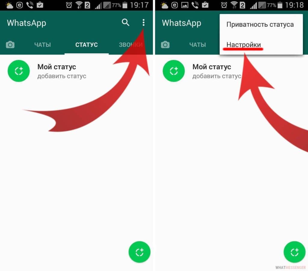 - Перейдите в раздел «СТАТУС» приложения WhatsApp для Android и коснитесь кнопки «…» справа от надписи «Мой статус».