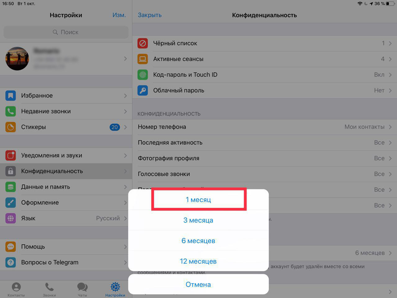 Временной период можно изменить внутри Телеграм – установить более короткий срок для самоуничтожения учетной записи, например, 1 месяц.