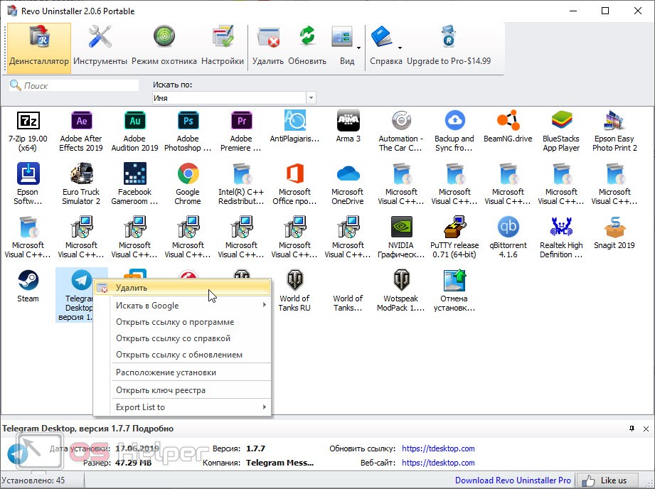 - В списке программ находим Telegram и делаем правый клик мышью по его иконке. Из появившегося контекстного меню выбираем пункт удаления точно также, как это показано на скриншоте ниже.
