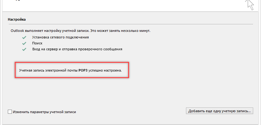 Как видите, все прошло успешно. Вновь появилось окно, оповещающее о том, что настройка учётной записи выполнена. Жмите “Готово”.