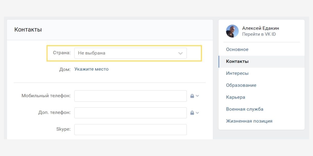 Если не хотите, чтобы на закрытой странице отображались место работы и город, эти данные придется удалить – скрыть их не получится. Для этого перейдите в раздел «Контакты», найдите блок «Страна» и выберите пункт «Не выбрана».