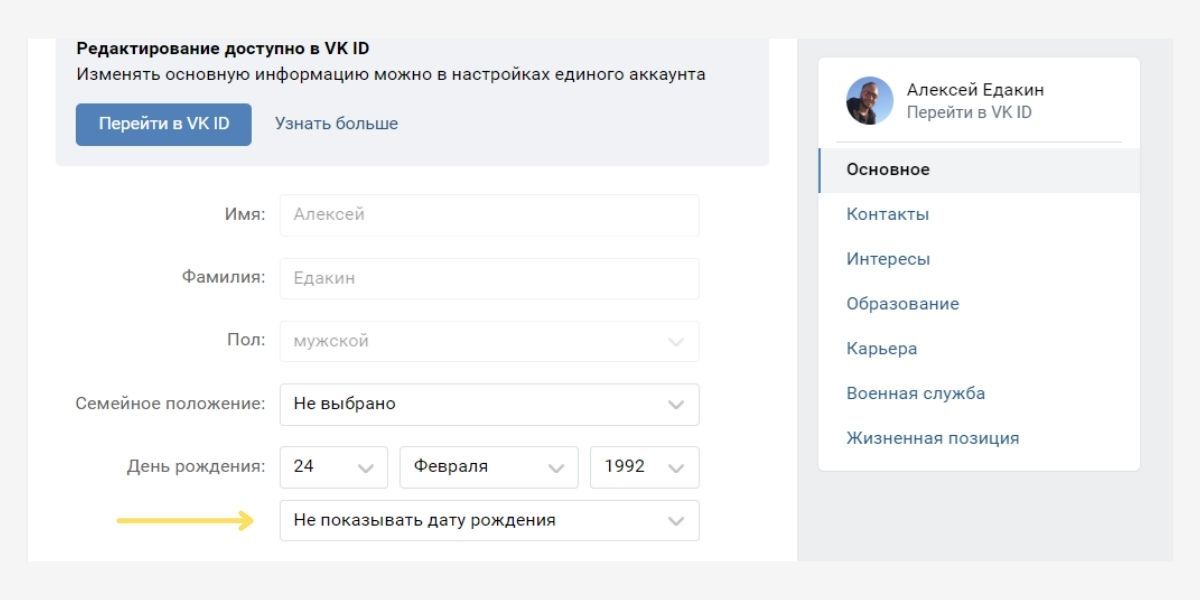 Закрыть профиль в ВК – это еще не все. Дополнительно можно убрать дату рождения. Делается это в настройках вашей анкеты. Там же, кстати, можно включить пункт «Верифицированный аккаунт». О том, как получить заветную галочку, читайте в статье «Как пройти верификацию ВКонтакте: полный гайд для экономии времени».