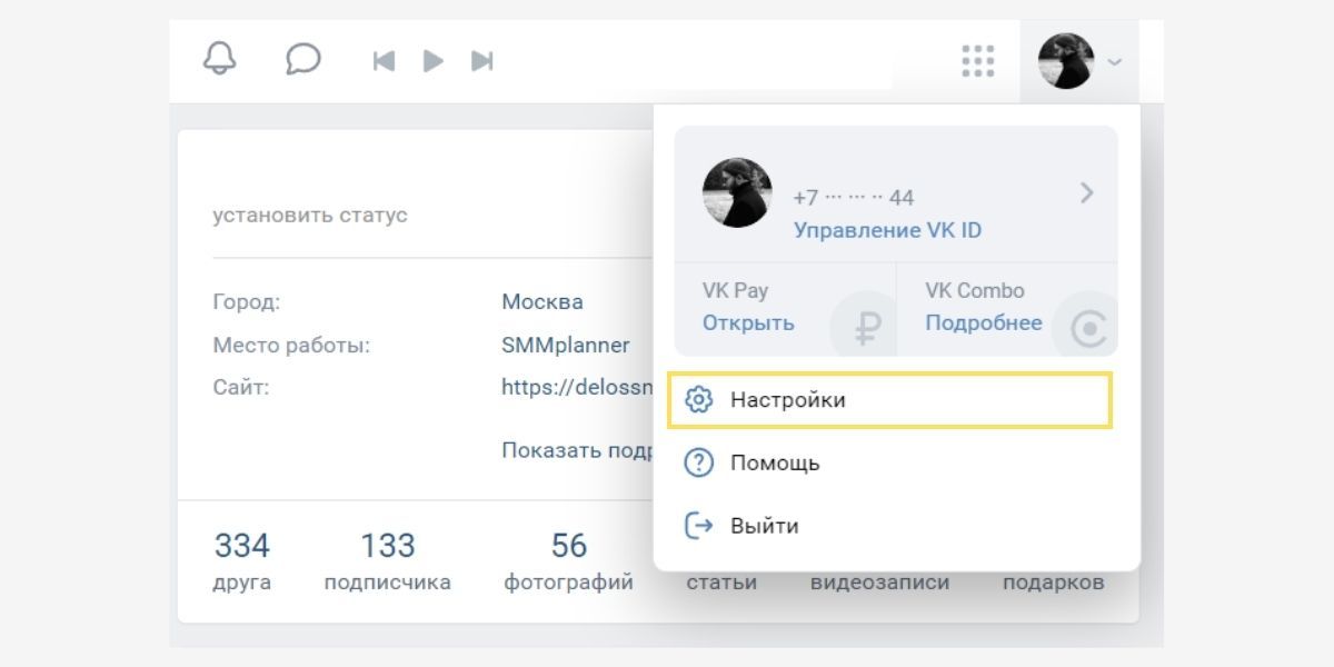 Зайдите во ВКонтакте и откройте VK ID. Для этого выберите кнопку с вашей аватаркой в правом углу. Нас интересует пункт «Настройки».