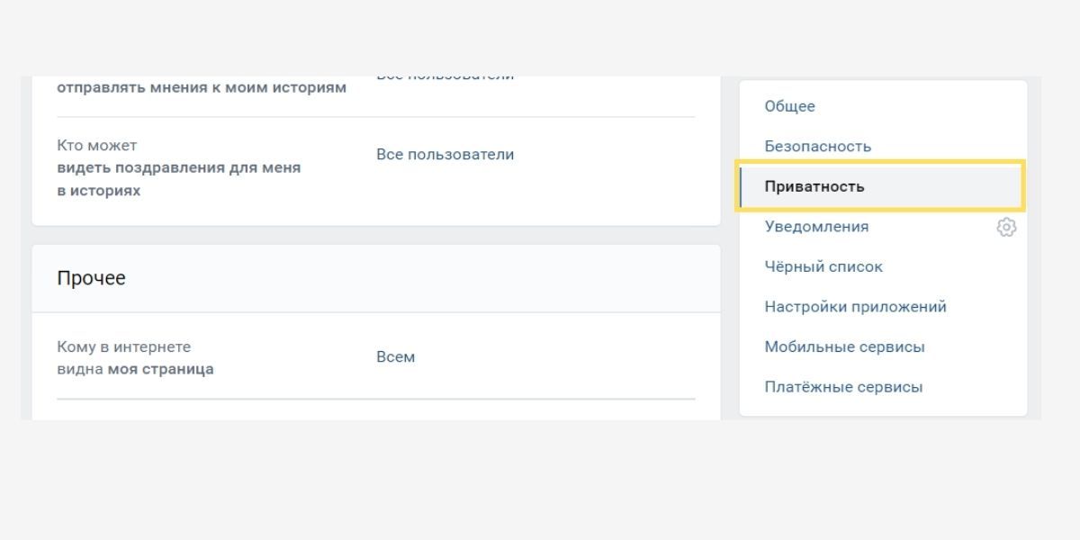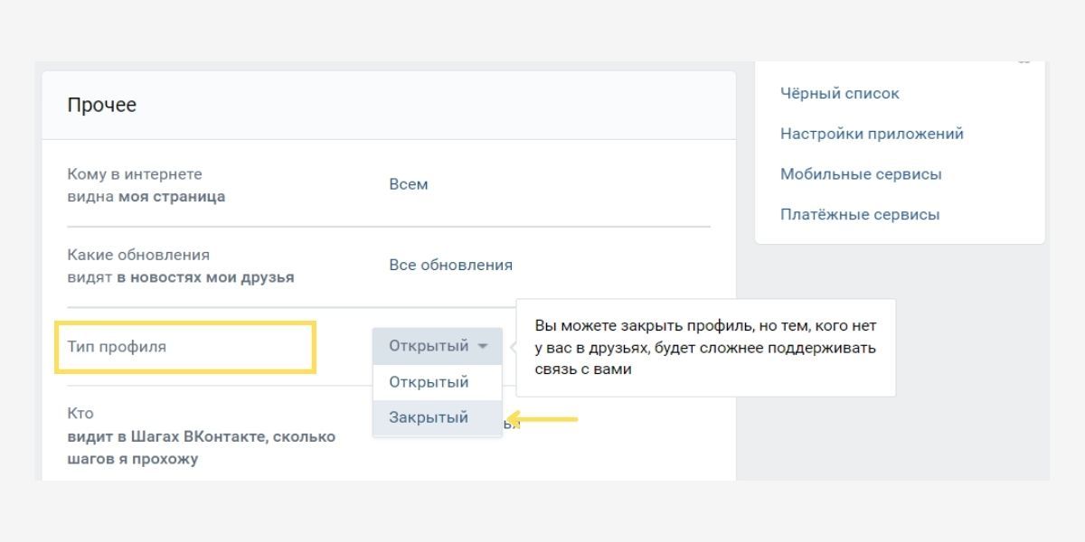 Переключите профиль на закрытый в «Типе профиля». Для этого пролистайте раздел «Приватность» до самого конца и найдите подраздел «Прочее».