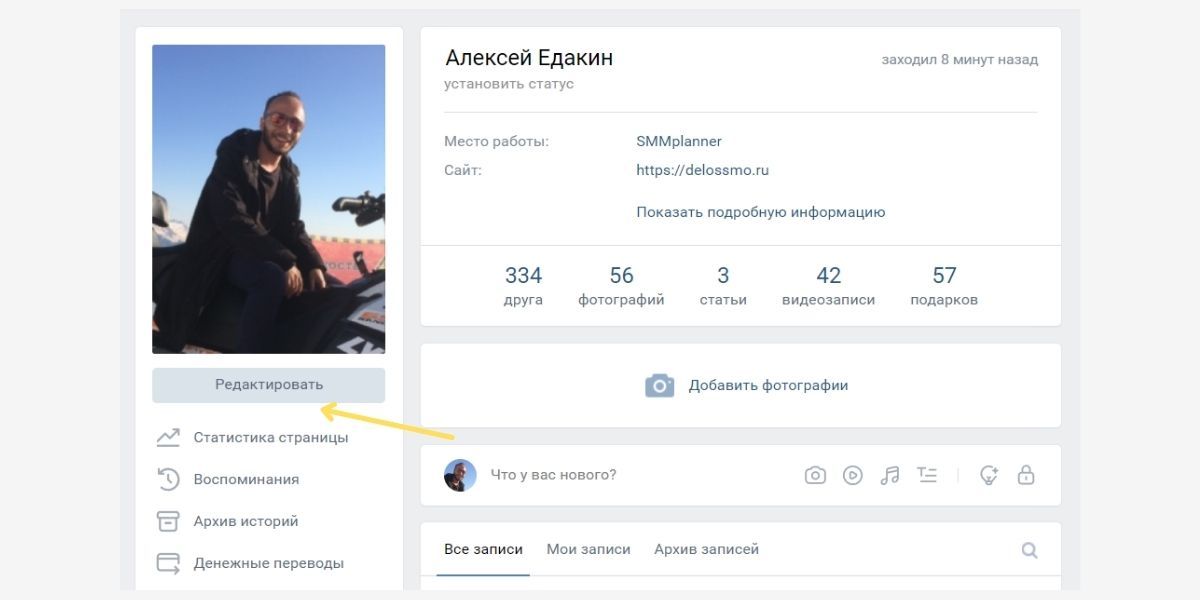 Зайдите на главную страницу профиля и выберите «Редактировать» под аватаркой.