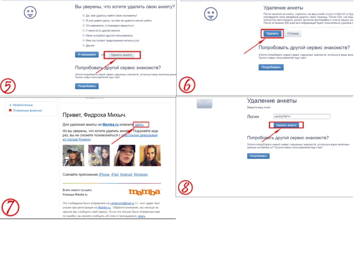 Для удаления с Мамбы не только анкеты, но и вашего аккаунта, выберите «Удаление анкеты» и нажмите кнопку «Далее». После чего в новом окне для подтверждения вашего решения еще раз щелкните по слову «Далее». В сообщении, где содержится с уведомление о высланном письме со ссылкой для удаления анкеты, снова нажмите «Далее».
