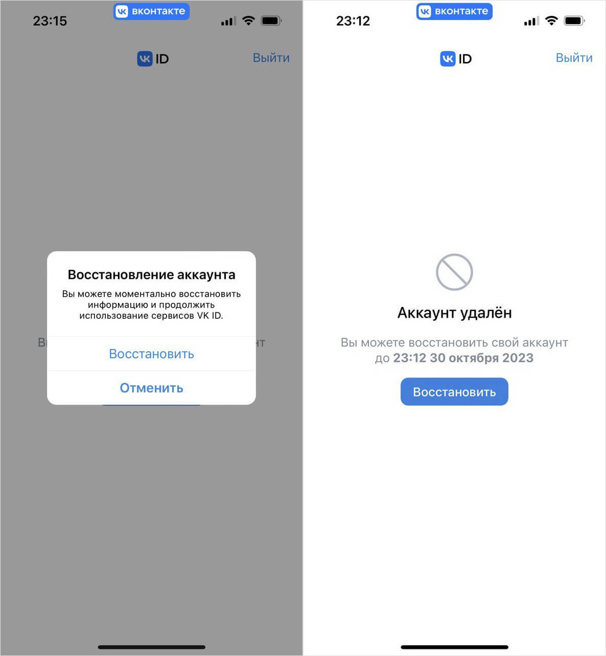 После этого на главной странице у вас появится информация о том, что страница во ВКонтакте удалилась и до какой даты ее можно восстановить. Кроме того, на экране будет гореть кнопка «Восстановить»: теперь она будет отображаться всегда, когда вы будете заходить в приложение