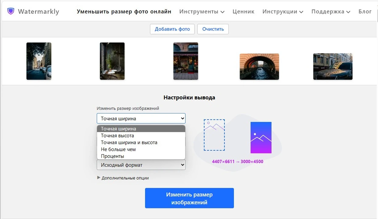 В настройках приложения вы можете выбрать одну из 5 опций уменьшения размера фото: «Точная ширина», «Точная высота», «Точная ширина и высота», «Не более чем» или «Проценты».