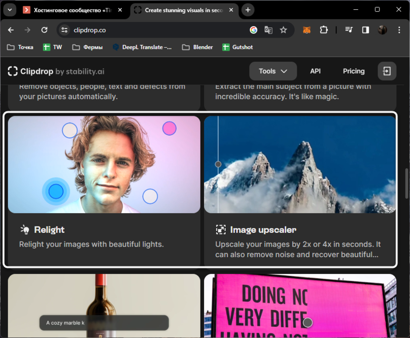Скачивание доступно бесплатно, поэтому по завершении можно сразу получить результат без каких-либо предварительных регистраций или оформления пробных премиум-подписок. Clipdrop пока можно считать самым многофункциональным сайтом, собрав в себе разные нейронки, большая часть которых предназначена именно для обработки фотографий.