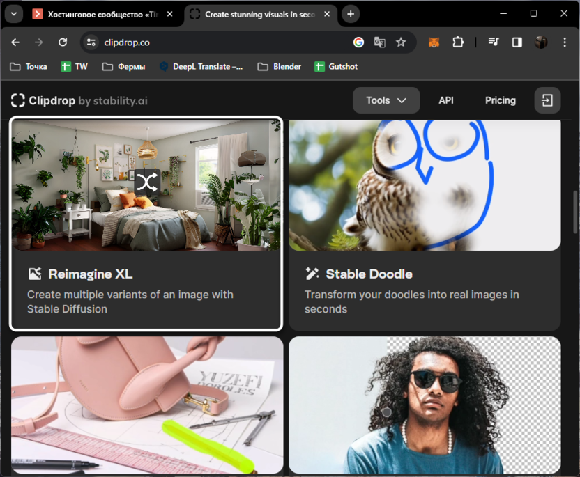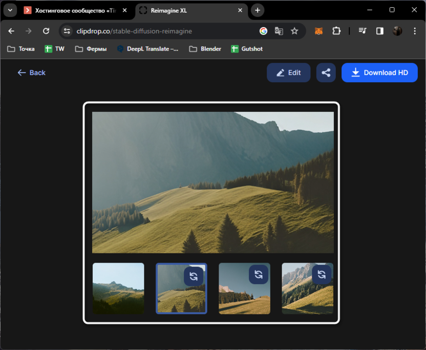 Отдельно отмечу еще один инструмент, представленный тут на главной странице. Он называется «Reimagine XL» и предназначен для создания новых вариантов готовой картинки. Базируется на модели искусственного интеллекта Stable Diffusion, поэтому результаты всегда получаются качественными и из нескольких представленных точно получится что-то выбрать.