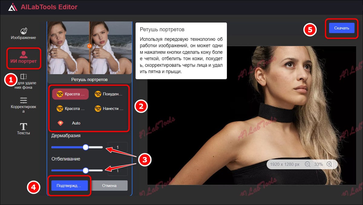 Ailabtools – универсальный сервис с помощью которого можно улучшать общее качество фото. Специальный инструмент «Ретушь портретов» дает возможность подкорректировать лицо. Содержит пять функций: