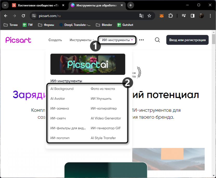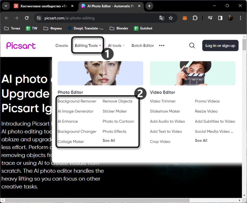 Онлайн-сервис PicsArt постоянно обрастает новыми функциями, связанными с искусственным интеллектом. Если ранее это был простенький графический редактор, то сейчас сайт можно использовать для полноценного генерирования новых изображений или значительной перекройки старых. На главной странице можно открыть раздел с инструментами для редактирования, чтобы посмотреть, сколько всего есть, связанного с AI. Тут и удаление фона, и улучшение качества изображения, замена объектов, и создание картинок по промтам с использованием сторонней модели нейронки.