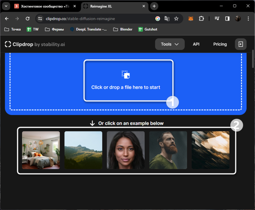 Как раз на примере этого инструмента предлагаю разобрать принцип взаимодействия с Clipdrop. Сайт предлагает загрузить собственное изображение для обработки или выбрать один из примеров, чтобы просто проверить функционирование искусственного интеллекта. Тут отталкивайтесь от собственных целей и предпочтений. Выберите снимок и переходите к следующему шагу.