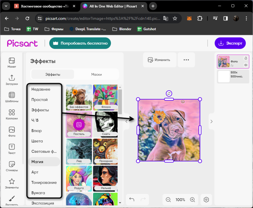 | Pixlr | JPG, WebP, PNG | Стандартные инструменты редактирования, ретушь, художественные эффекты и фильтры, работа со слоями | 370 руб./мес. |