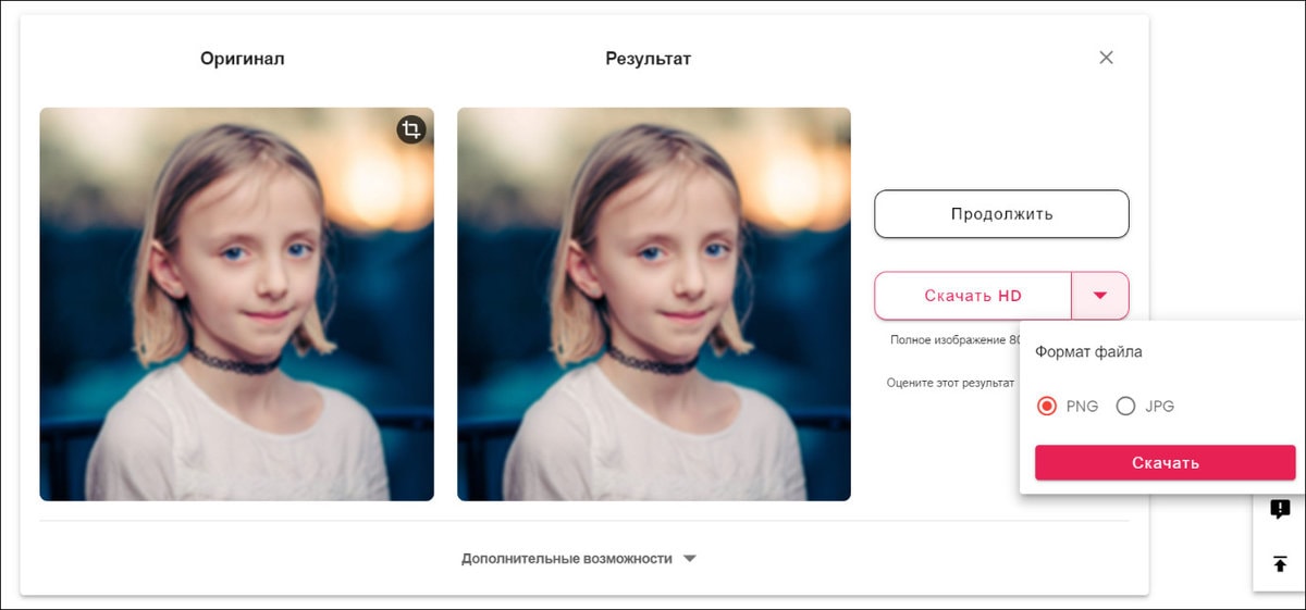 Результат сохраняется на ПК в формате JPG или PNG в стандартном качестве.