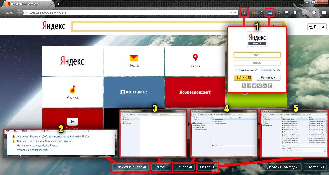 Ниже находятся кнопки для доступа к некоторым функциям браузера: