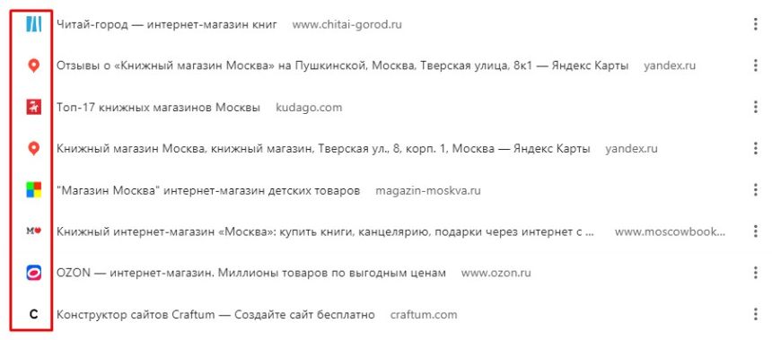 Все описанное выше касалось SEO опосредованно, но есть веб-интерфейсы, в которых маленькое лого напрямую влияет на поисковое продвижение. Речь идет, конечно же, о сниппетах в поисковой выдаче. Без фавикона они менее заметны. В этом случае сниппеты сливаются с белым фоном и никак не выделяются среди конкурентов. В условиях, когда нужно использовать все имеющиеся средства в борьбе за высокий CTR сниппета, пренебрежение качественным фавиконом — это серьезный просчет.