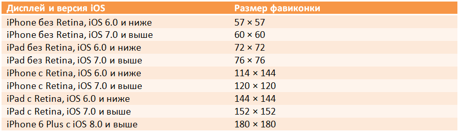 В отличие от Android, размер иконок для iOS-устройств зависит от наличия Retina и версии операционной системы. В таблице это выглядит так:
