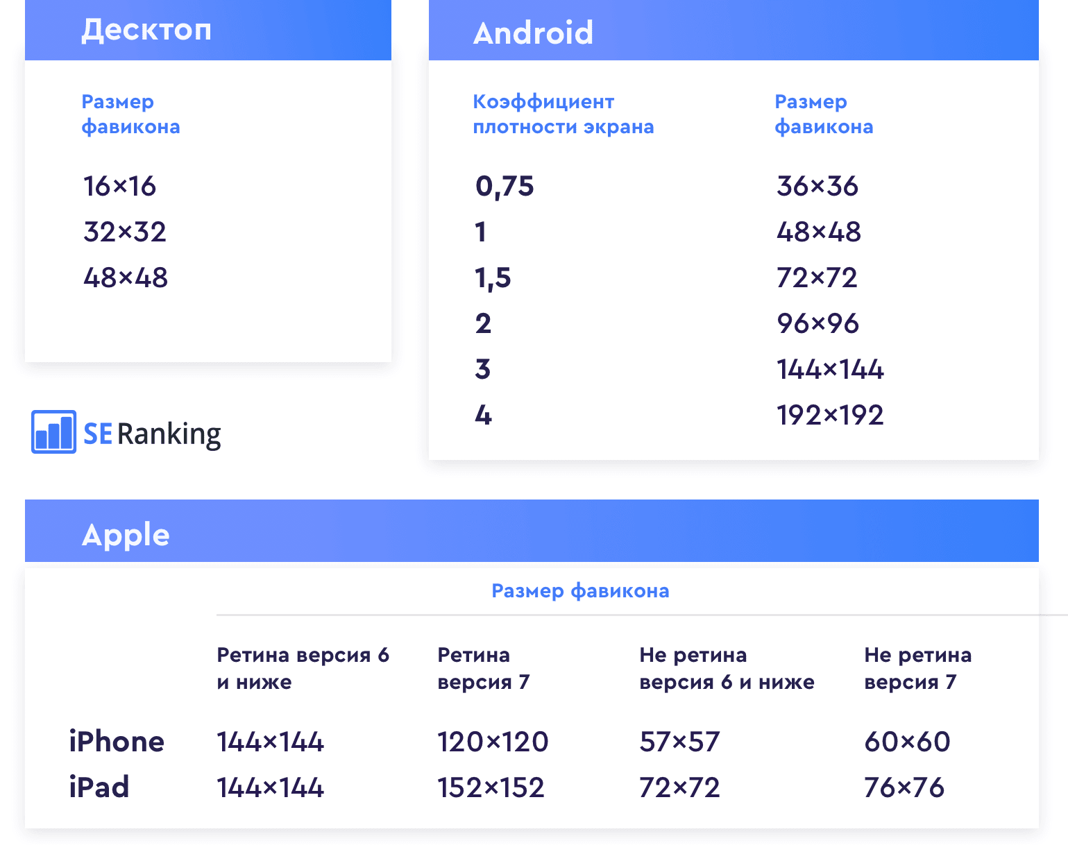 Другие размеры, которые обычно используются для фавикона в зависимости от типа и операционки устройства: