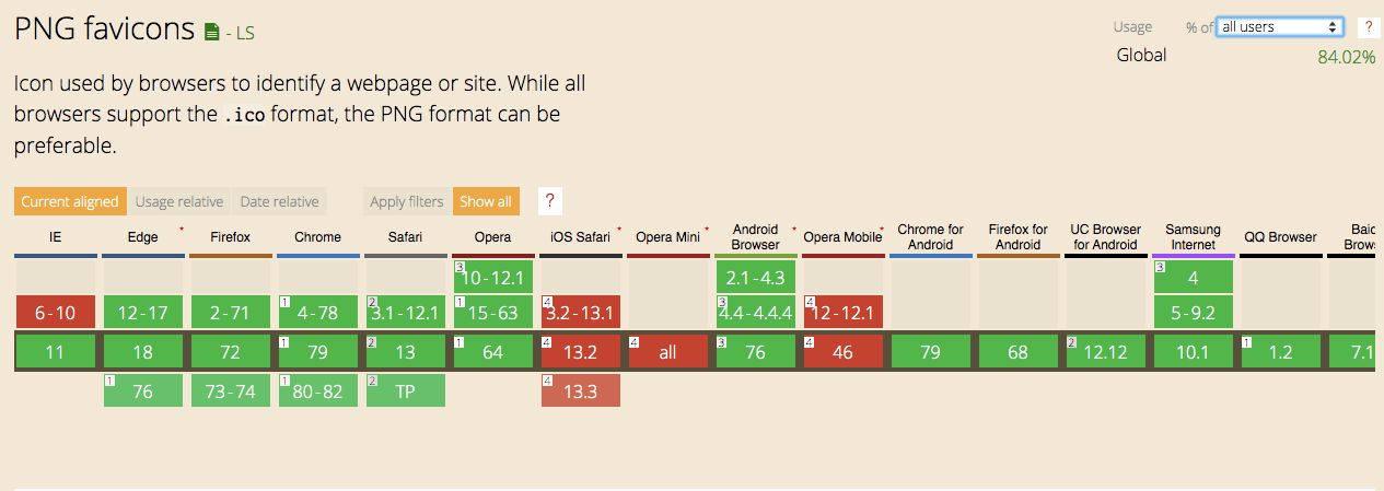 Узнать, какие именно форматы фавиконов поддерживают разные браузеры, можно с помощью онлайн-сервиса . Например, вы сможете увидеть, какие браузеры поддерживают или не поддерживают фавиконки в формате PNG и SVG.
