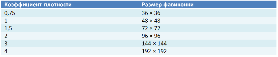 Выбор фавиконки для Android-устройства зависит от показателя PPI (pixels per inch – пикселей на дюйм); это важно учитывать, так как из-за этого одно и то же изображение может выглядеть по-разному на экранах с различным параметром PPI. Общая таблица с указанием коэффициента плотности и соответствующего ему размера фавиконки выглядит следующим образом: