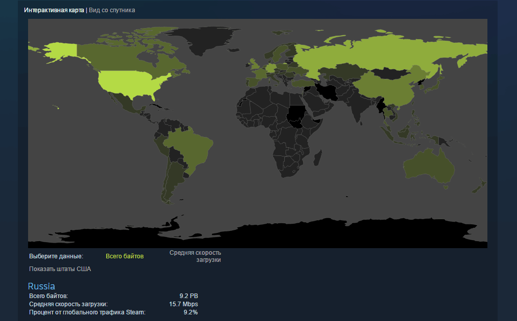 Обратите также внимание на глобальную карту трафика (когда в Steam начинаются распродажи игр – увеличивается нагрузка на каналы серверов, что сказывается на скорости загрузки)