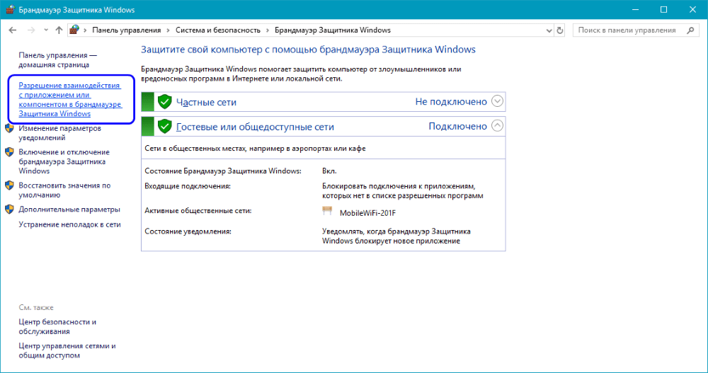 В открывшемся меню в левой части окна выберите опцию «Разрешение взаимодействия с приложением или компонентом в брандмауэре Защитника Windows».