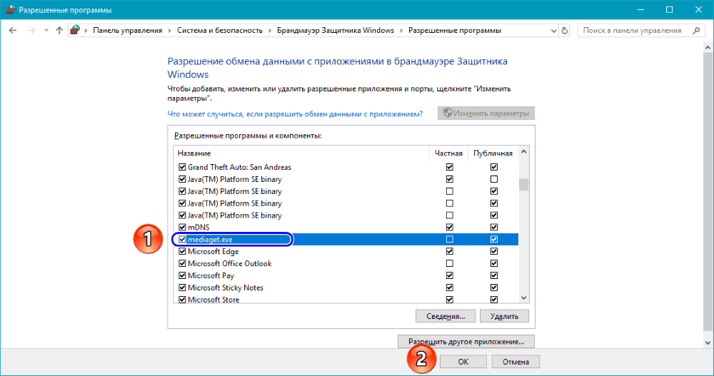 Брандмауэр может блокировать входящие и исходящие соединения МедиаГет. Чтобы это не происходило, нужно внести клиент в исключения этой системной утилиты.