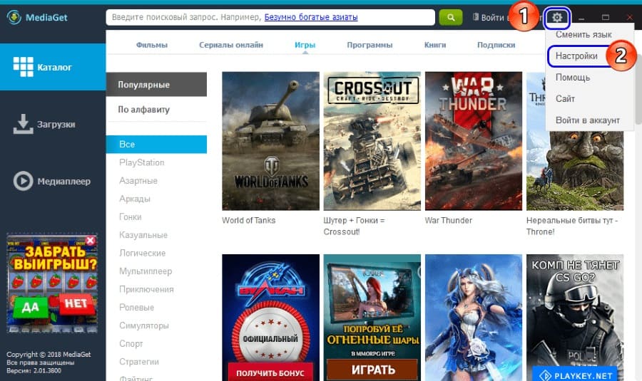 Пользователь мог случайно поставить низкую скорость загрузки и отдачи. Чтобы повысить скорость, нужно привести настройки в порядок. Откройте главное меню MediaGet, в правом верхнем углу кликните по шестерёнке. В выпадающем списке нажмите «Настройки».