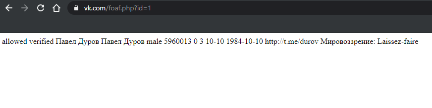- в другой вкладке браузера введите vk.com/foaf.php?id= ваш_ID ( » ваш_ID » замените на ID человека из ссылки на его профиль);