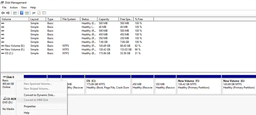 После очистки всех разделов с диска вы можете щелкнуть диск правой кнопкой мыши в «Управление дисками» и выбрать «Преобразовать в диск GPT» или «Преобразовать в диск MBR». Эта опция будет доступна только после удаления всех разделов.