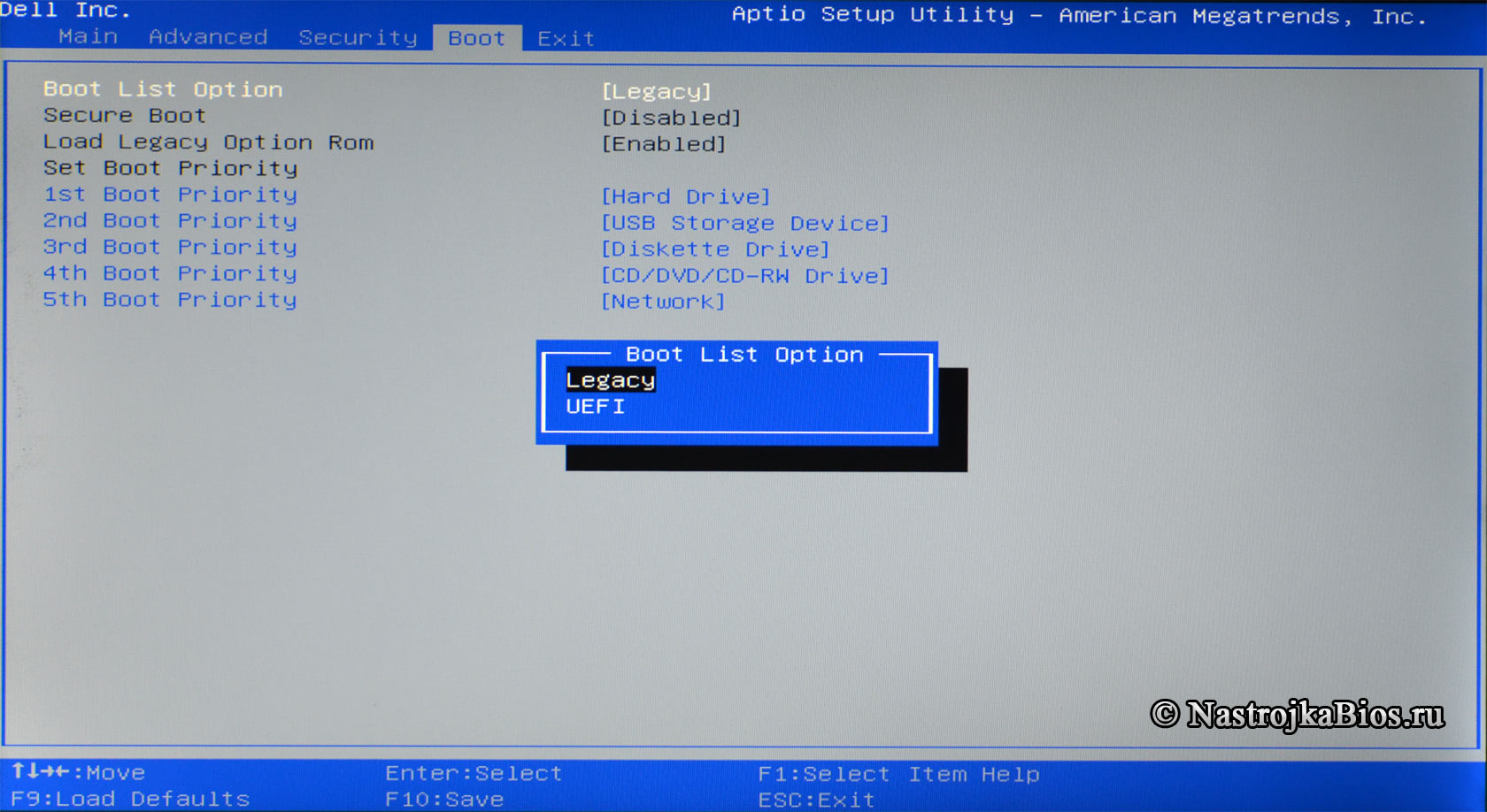 2. Оставить текущий стиль и изменить в БИОС (UEFI) значение с EFI на значение Legacy в меню приоритетности загрузки.