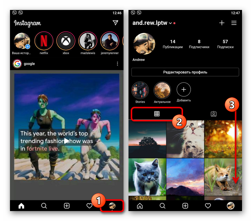 - Для удобства первым делом отройте список публикаций с помощью нижней панели в мобильном клиенте Инстаграма и выберите запись, данные о репосте которой вас интересуют. Также можете прибегнуть и к другим способам поиска своего контента, однако материал обязательно должен быть обычным фото или видео.