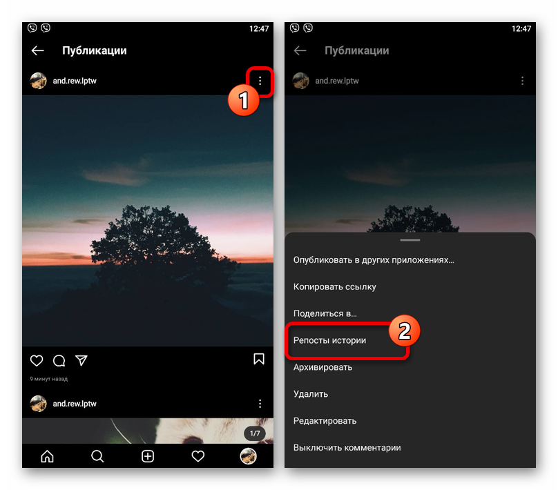 Коснитесь значка с тремя вертикальными точками в правом верхнем углу публикации и во всплывающем окне воспользуйтесь опцией «Репосты истории»