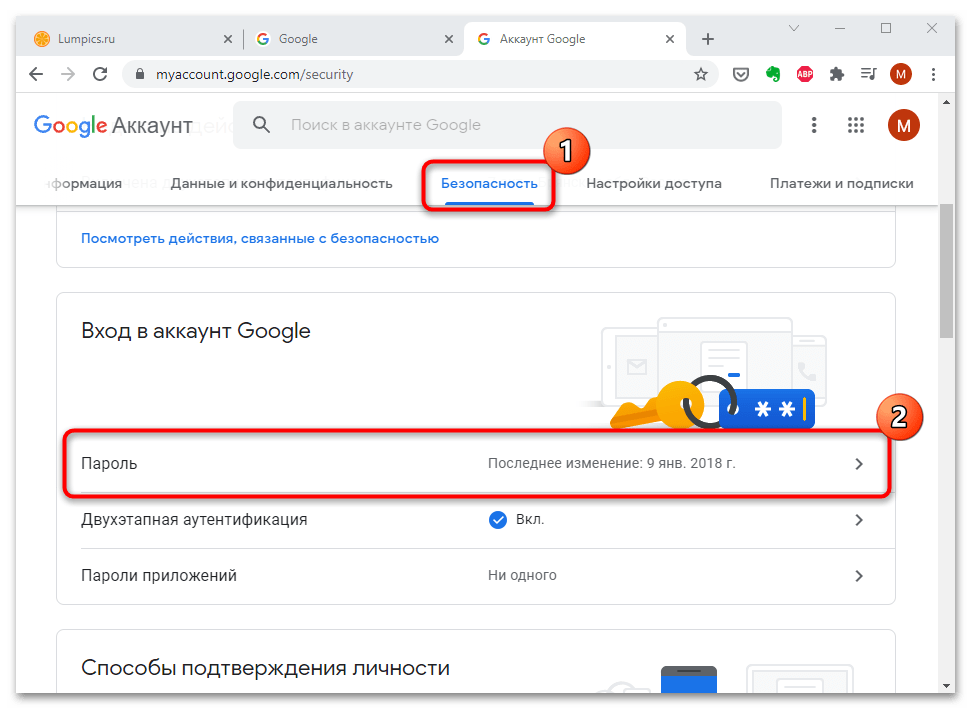 Также пароль можно посмотреть через вкладку «Безопасность». В разделе «Вход в аккаунт Google» есть информация об учетных данных и настройка входа в профиль: активация функции входа с помощью телефона и двухэтапная аутентификация.