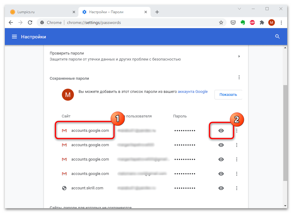 Следующий метод позволит вам перейти к менеджеру паролей, который присутствует во всех современных браузерах. Он отвечает за автозаполнение и хранение учетных данных аккаунтов, чтобы их не приходилось каждый раз вводить при авторизации. Конечно, узнать таким методом пароль от вашей почты Gmail можно только в том случае, если при авторизации он был сохранен в браузере.