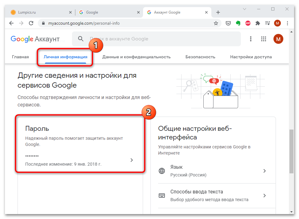 - В появившемся окне перейдите на вкладку «Личная информация». Найдите раздел с другими сведениями и настройками для сервисов Гугл. Щелкните по блоку «Пароль»: в нем отображается информация, когда он был изменен в последний раз.