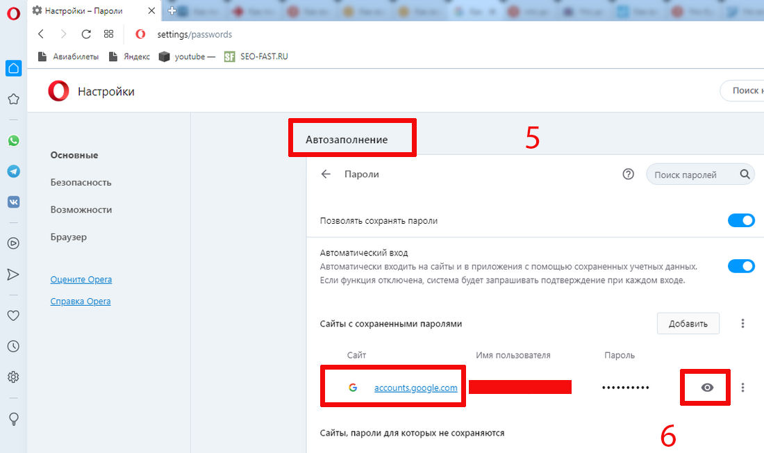 Для просмотра сохранённых паролей в этом браузере необходимо: