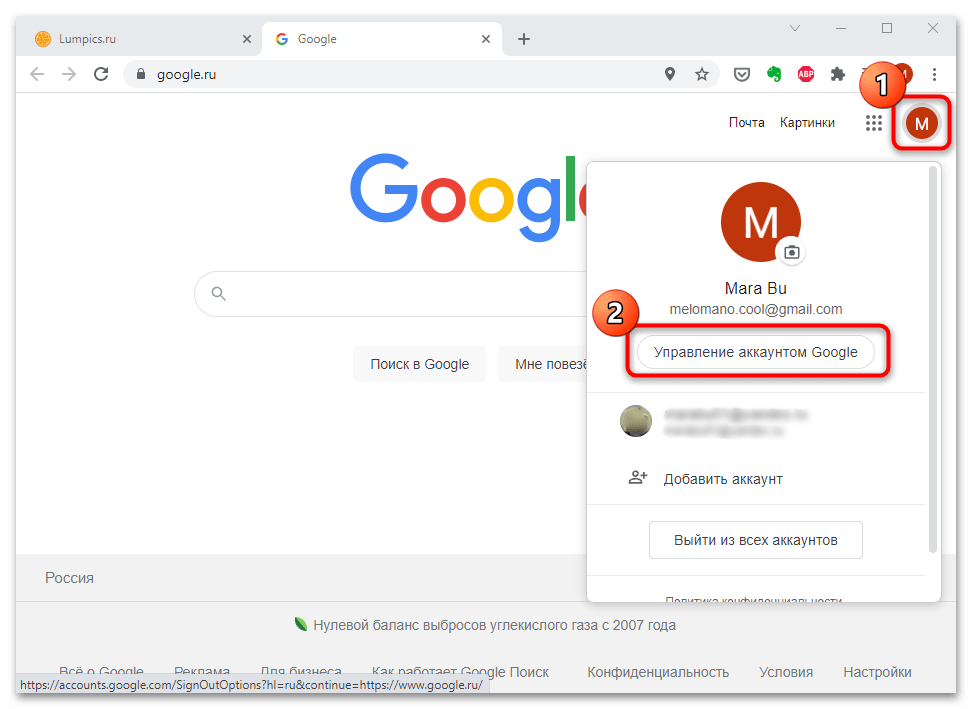 - Перейдите на главную страницу Google, затем кликните по аватарке аккаунта, расположенной в верхнем углу справа. Нажмите на кнопку «Управление аккаунтом Google».