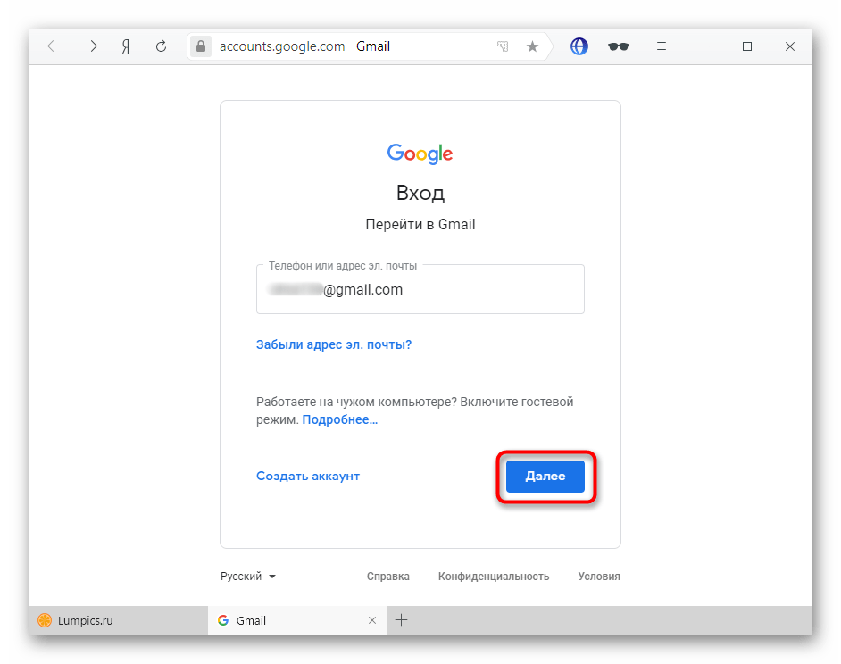 Если вы, как и я, не заходили в свой профиль через браузер на смартфоне, то это нужно сделать сейчас. Введите логин и жмите «Далее».