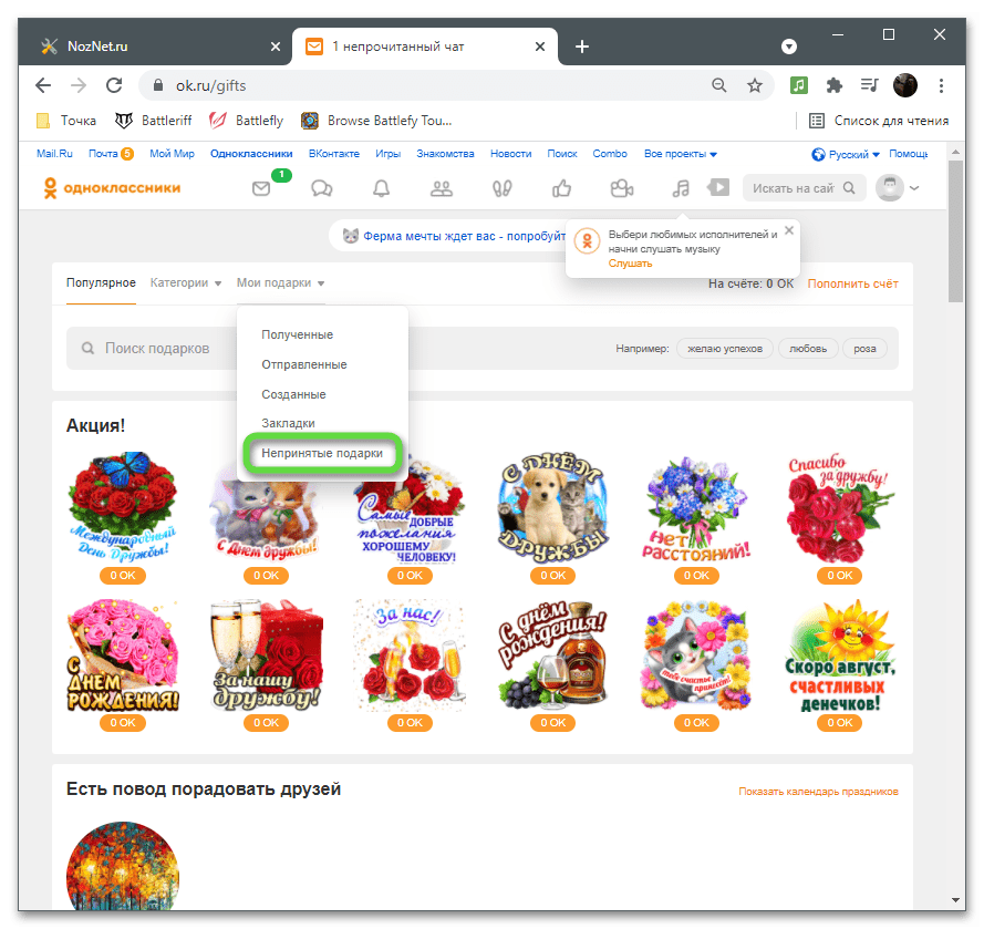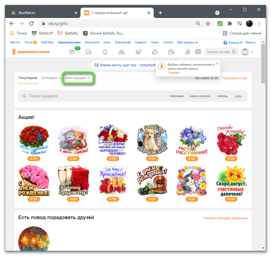 Как мы уже написали выше, в ОК можно отсылать друг другу подарки.