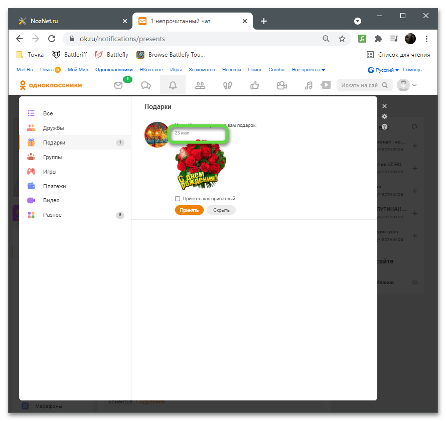 Если друг отправил вам по «Одноклассникам» приватный подарок, в разделе «Оповещения» вы увидите сообщение такого содержания: