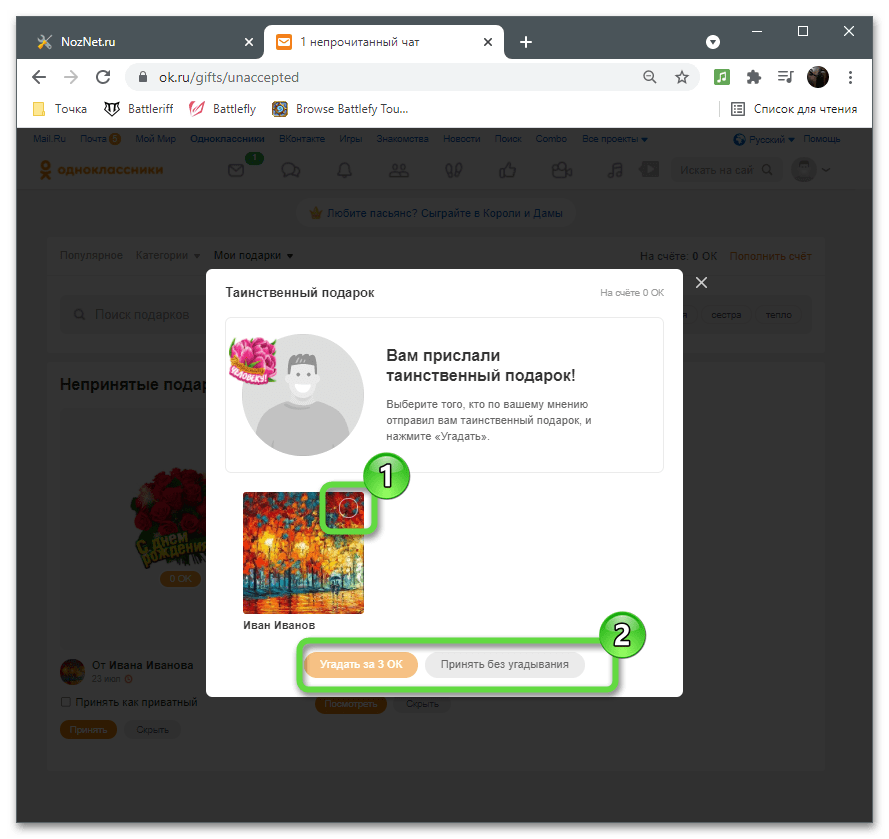 Далее ознакомьтесь с представленной на экране информацией о том, удалось ли вам угадать отправителя, и кто же на самом деле им был. Если же у вас нет такой суммы ОК или вы не хотите ее тратить, подарок можно принять без отгадывания и попытаться самому понять, кто является отправителем, или же заработать ОКи без траты денег, прочитав инструкцию из следующего способа.