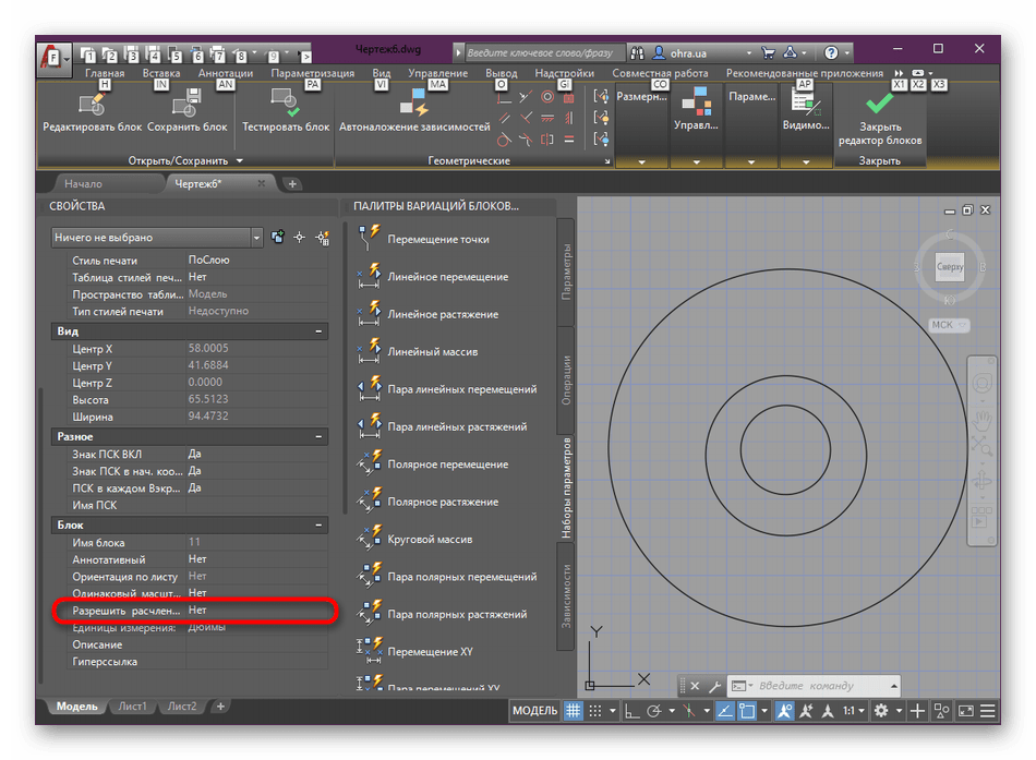 - В палитре свойств (Ctrl+1) в разделе «Блок» выберите параметр «Разрешить расчленение».