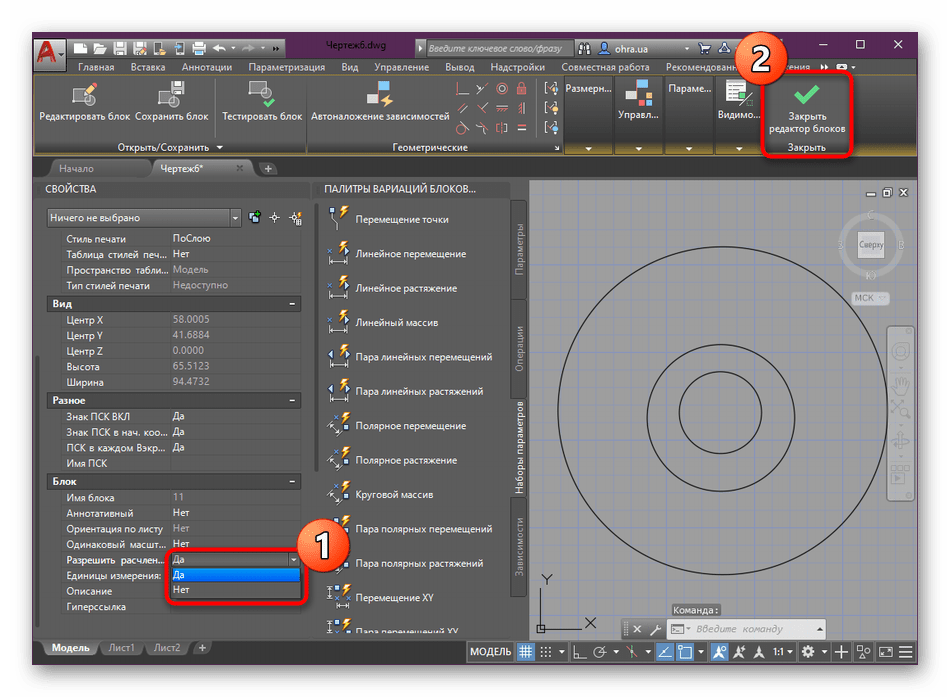 Там скорее всего стоит «Нет», именно поэтому блок и не взрывался. Меняем «Нет» на «Да». После этого закрываем Редактор блоков (кнопка «Закрыть» расположена в ленте сверху справа) и соглашаемся на сохранение изменений: