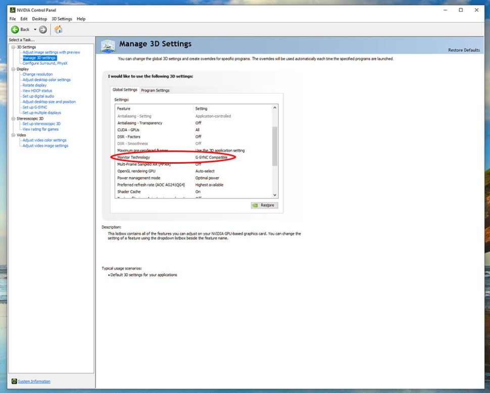 Если после выполнения вышеуказанных шагов параметр «Настройка G-Sync» не появился, перейдите в поле «Настройки 3D» и кликните «Глобальные». Прокрутите вниз до Monitor Technology и выберите «G-Sync Compatible».