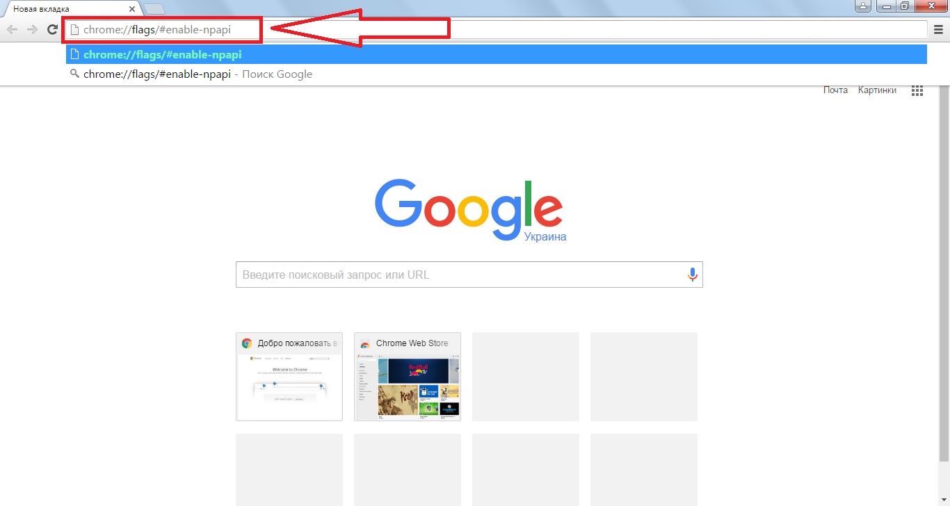 - В адресной строке вписать следующее: «chrome://flags/#enable-npapi». Это показано на рисунке №1. Делается это очень просто, проблем возникнуть не должно. После того как запрос набран, следует нажать кнопку Enter на клавиатуре.