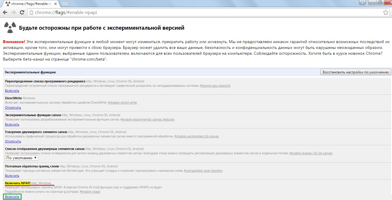 Как видим, NPAPI находится в списке экспериментальных функций. Это означает, что, включая одну из них, пользователь делает это на свой страх и риск.