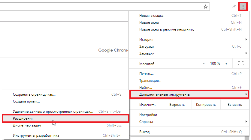 Необходимо открыть меню браузера , выбрать пункт «Дополнительные инструменты» — «Расширения»:
